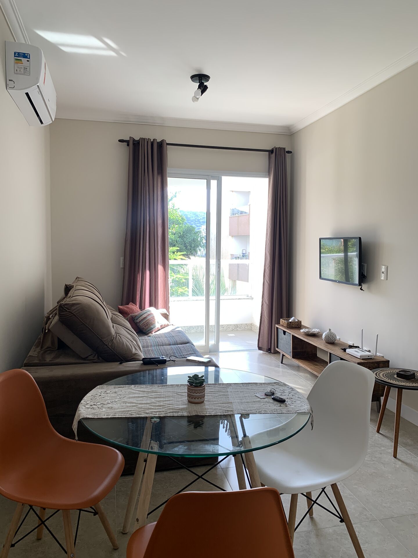 O apartamento está totalmente mobiliado, pronto para morar.